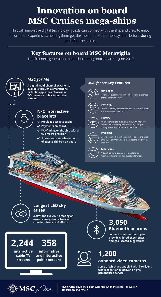 MSC for Me debutterà a bordo di MSC Meraviglia, la prima delle 11 unità in costruzione, che entrerà in servizio a giugno e che sarà dotata di 16mila punti di connettività, 700 punti di accesso digitali, 358 schermi informativi e interattivi e 2244 cabine dotate di tecnologia RFID/NFC. Il programma verrà poi implementato anche su MSC Seaside, che sarà battezzata a novembre di quest’anno.